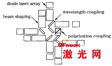 圖7 波長禍合原理示意圖 由于半導(dǎo)體激光是線偏振光,可以用λ/2波片將其偏振方向旋轉(zhuǎn)90度。 ,因此通過偏振禍合可使2路激光合束,功率密度再增加1倍。偏振禍合原理如圖8所示。