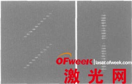 圖6 光束整形結(jié)果實(shí)驗(yàn)光斑圖 從圖6可以看出,光斑經(jīng)分段整形棱鏡組后被分成多段,并整齊地填充排列到兩個(gè)光斑中間的空白區(qū)域,提高了填充因子,再經(jīng)重排棱鏡組將光斑對(duì)齊。光源出光口的光斑尺寸為22mm*11mm,經(jīng)整形傳輸100mm后光斑尺寸為22mm*2mm。。