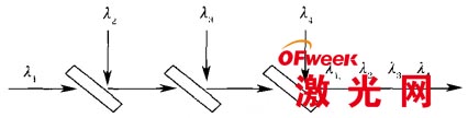 為了提高半導(dǎo)體激光器的功率,在不增加快軸方向光斑尺寸的情況下,采用了多波長禍合技術(shù)。本系統(tǒng)由808nm,915nm,940nm,980nm 4個(gè)波長組成。經(jīng)過波長鍋合單元,可使功率密度提高3倍。波長藕合原理如圖7所示。