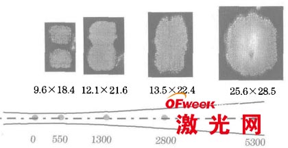 激光器光束質(zhì)量測量采用在不同距離上測量光斑大小,計(jì)算其發(fā)散角,最后得出光參數(shù)積的方法。圖9是光束傳輸?shù)讲煌嚯x時(shí)用相紙得到的光斑情況(單位:mm)。